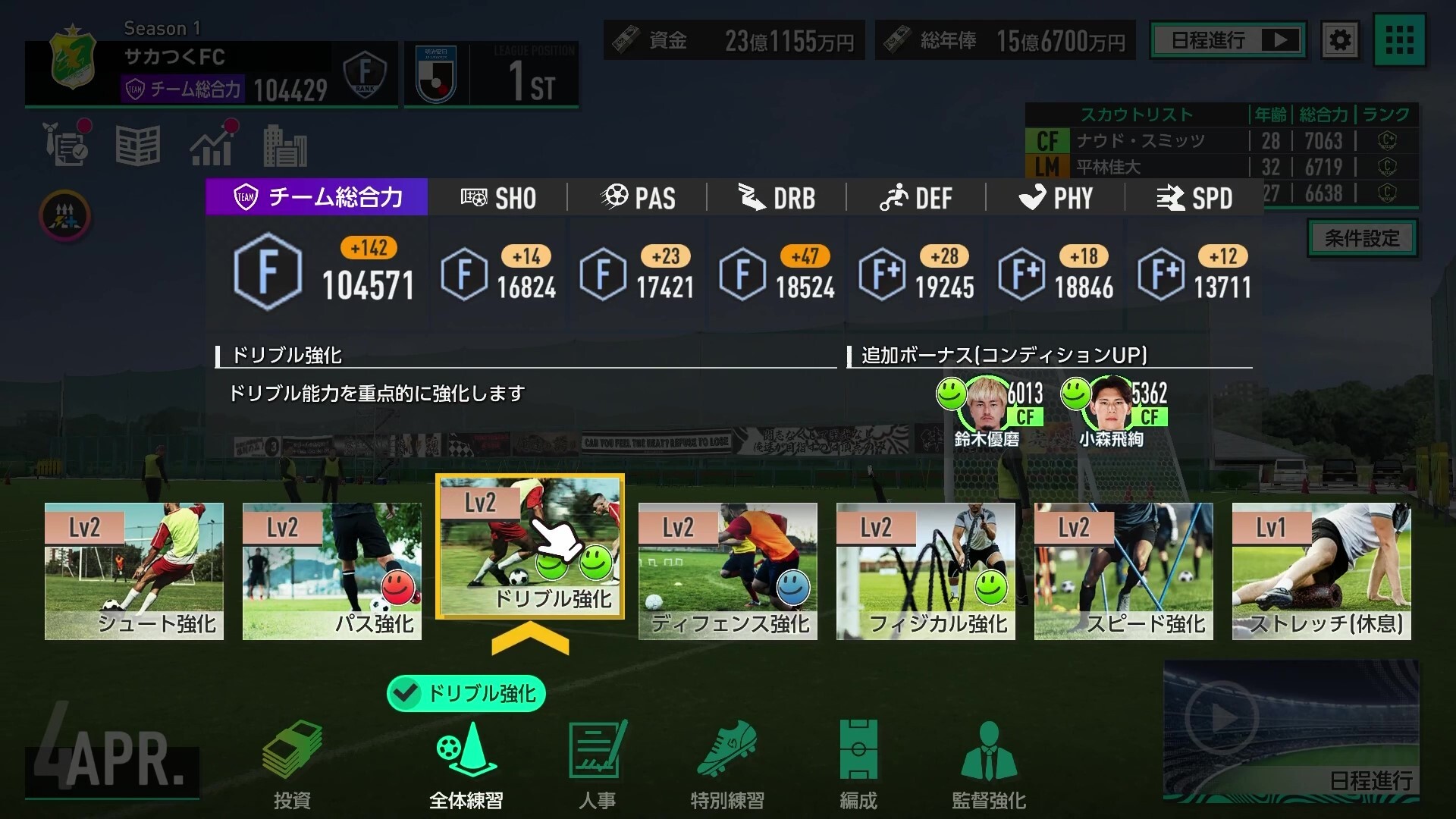 ゲームの核心は「選手を育て、チームを編成し、対戦で実力を証明する」という三位一体の循環にある。スカウトで獲得した選手にトレーニングを積ませ、試合形式に合わせた戦術を組み上げ、オンライン対戦でその成果を試す。この一連のサイクルが心地よいリズムを生み出しており、「あと一試合だけ」と気づけば深夜になっているタイプのゲームだ。特に選手のパラメータが目に見えて伸びていく育成フェーズは、数値をいじる快感が凝縮されており、昔ながらのサカつくファンには懐かしさとともに新鮮な驚きをもたらしてくれる。